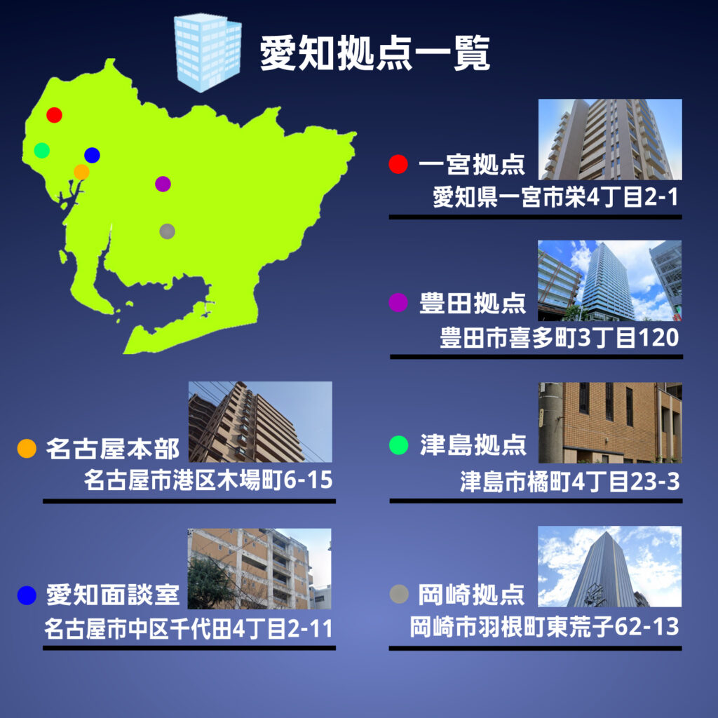 愛知県での面談は名古屋市中区にある面談室までお越しいただくか、お客様のご自宅やご都合の良い場所にある飲食店にお伺いする無料出張面談がご利用いただけます。