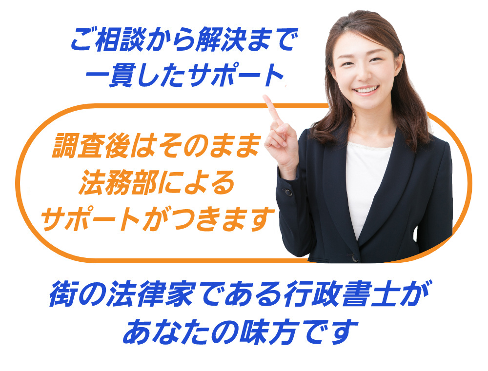 調査結果を踏まえて今後の動き方についてのアドバイスや、必要であれば法務部として行政書士による書面作成などを行い解決までサポートいたします。