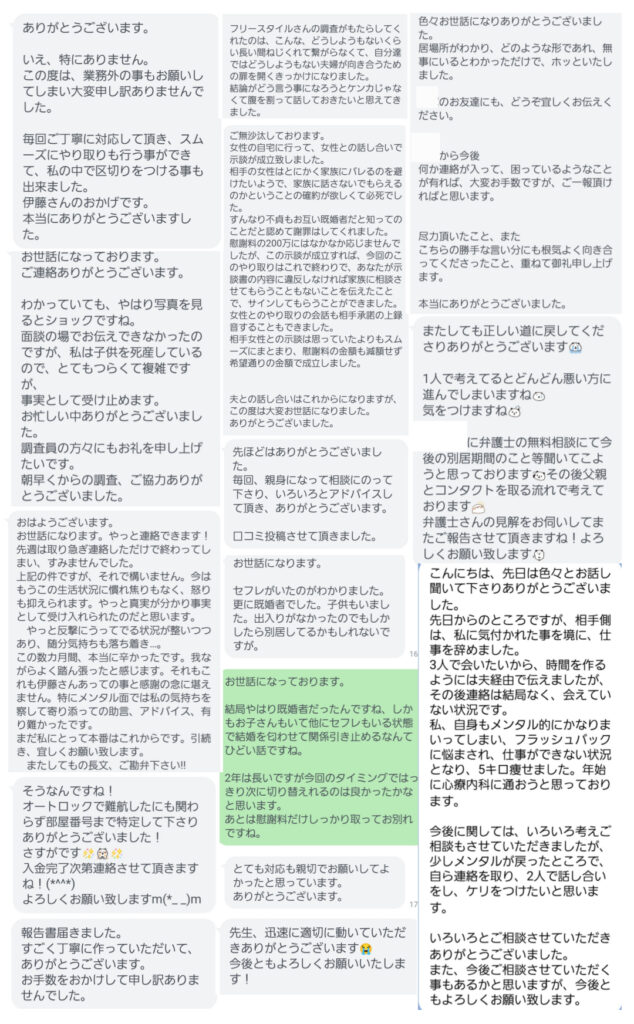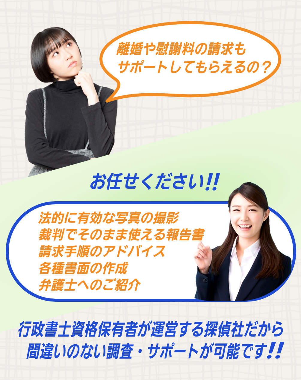 実際に、多くの探偵社では調査を行った後は報告時に今後のアドバイスを行うところはあっても、そのまま弁護士に業務を振って依頼完了としていますが、それでは依頼者様は弁護士事務所に足を運んで弁護士費用を支払って解決していかなくてはなりません。