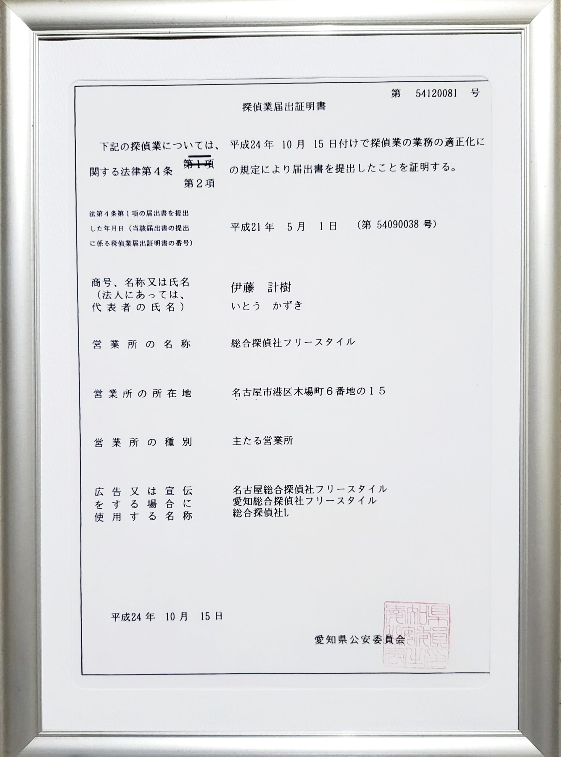 総合探偵社フリースタイル愛知名古屋本部は愛知県内の名古屋市・一宮市・豊田市・津島市・岡崎市に拠点を配置して愛知県全域の調査をカバーしている為、全て一律料金で無駄な費用が発生せず迅速な対応が可能です。