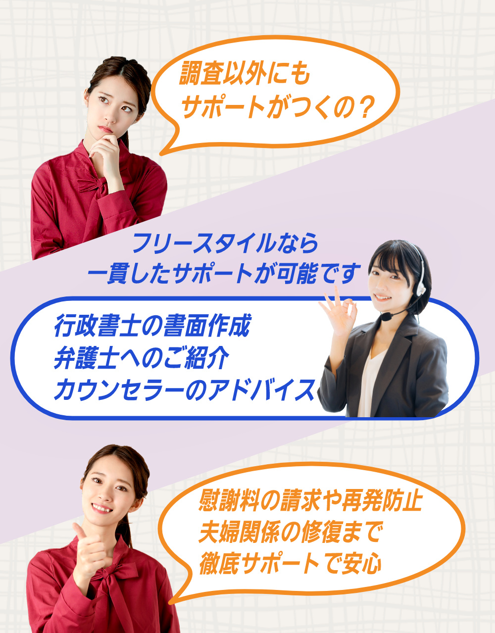 総合探偵社フリースタイルなら調査後も各支部の面談担当者やグループ本部の法務部で解決までアドバイスやサポートを行い、必要であれば書面の作成といった実務込みでのサポートまで可能となっております。