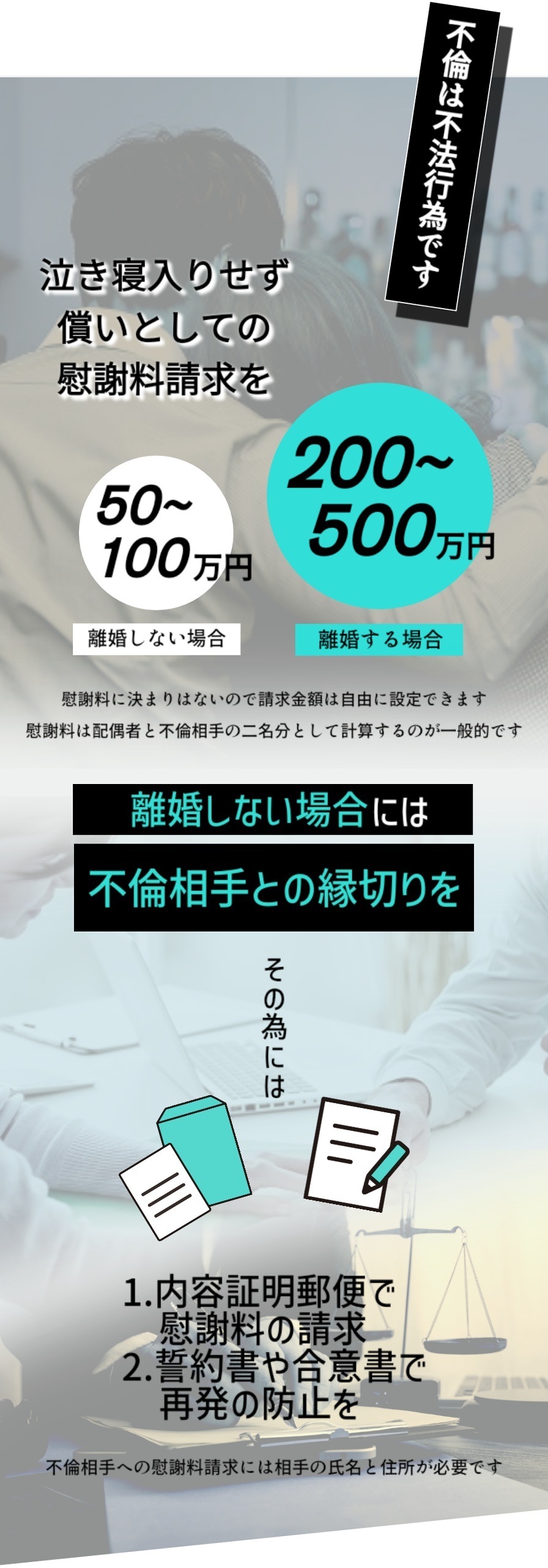 配偶者や不倫相手と「慰謝料」や「今後の交際について」などの合意条項をまとめた書面です。 |