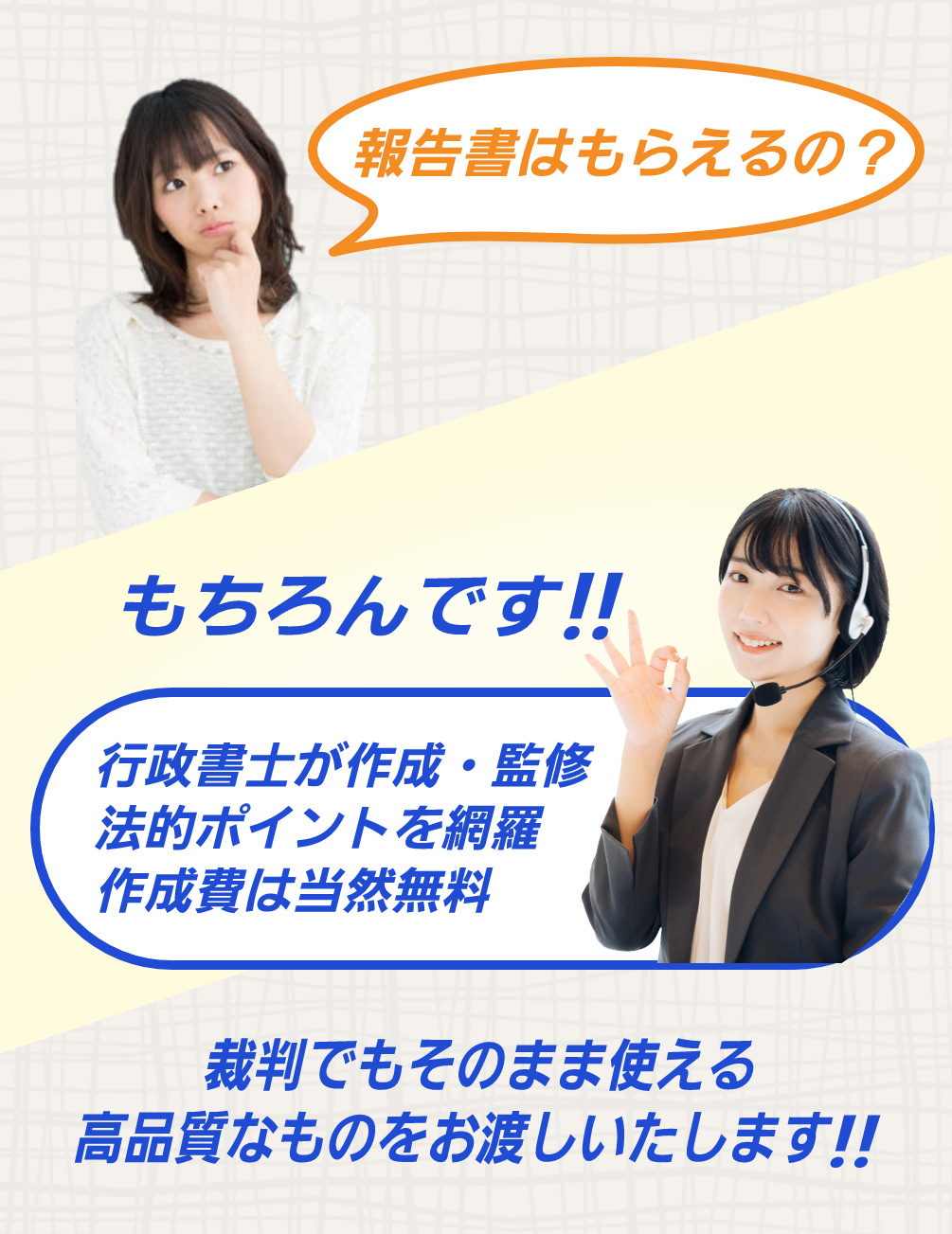 フリースタイルの報告書は行政書士が作成・監修する【裁判で勝てる報告書】なので、高い調査力と合わせてお客様の目的を達成する為のサポートが可能です。