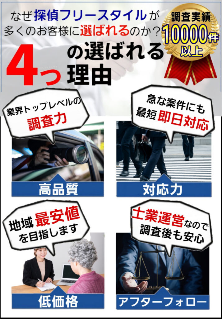 フリースタイルはこれまでの分かりづらい探偵業界の料金システムを廃止し、追加料金をなくして分かりやすく低価格な浮気調査を実現した料金システムなので初めて探偵事務所をご利用いただくお客様にも安心していただけます。