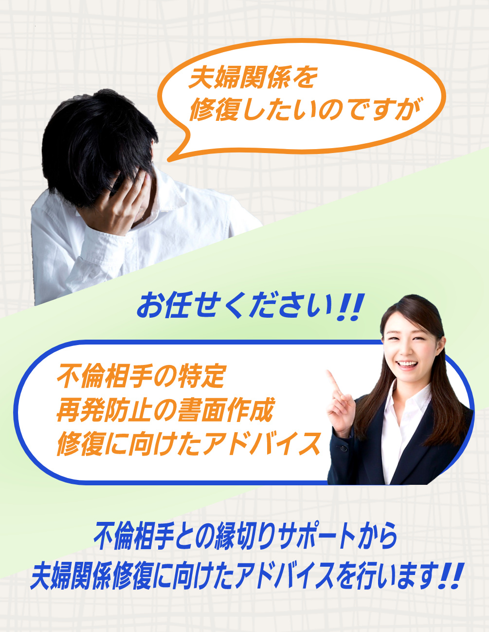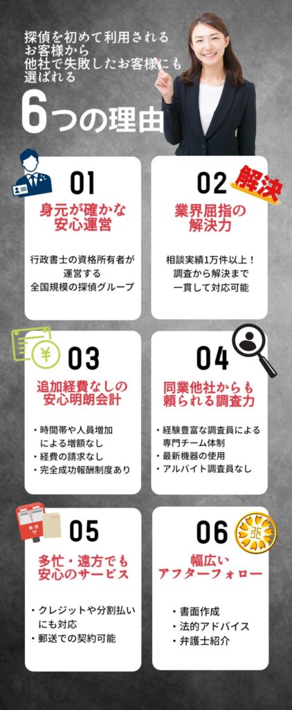 何をどう進めていけばいいかわからず不安だというお客様は調査だけでなく解決することができる探偵である【総合探偵社フリースタイルグループ】にお気軽にご相談ください。