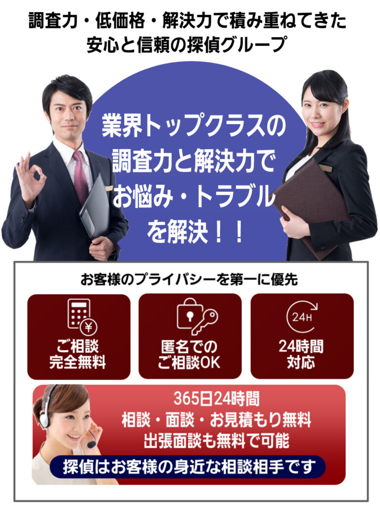 調査料金に関してましてはお客様がお知りになりたい相手の情報の範囲によって複合的に調査を行うことが多く、調査料金に関してもご相談内容に合わせたプランをその都度お見積もりする為、まずはお気軽にお問い合わせください。